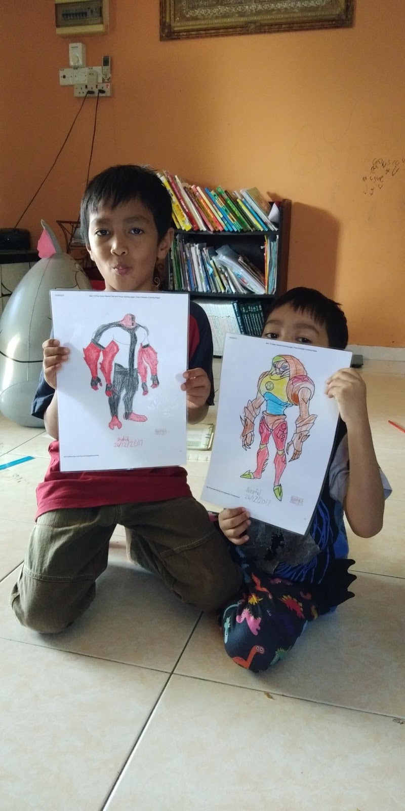 Hari ini umi dah mula mesyuarat. Tinggallah ayah, Shahid dan Naufal. Oren pula tak habis- habis menggesel pada ayah yang tengah buat kerja. Dua tiga kali ayah hantarnya ke luar dan Oren masuk balik ikut tingkap. Shahid dan Naufal dari malam tadi main kereta. Pagi ini, mewarna. Ayah mencetak watak kartun Ben 10. Untuk lebih tahan lama, ayah gunakan lapisan perlaminaan (laminating sheet).
